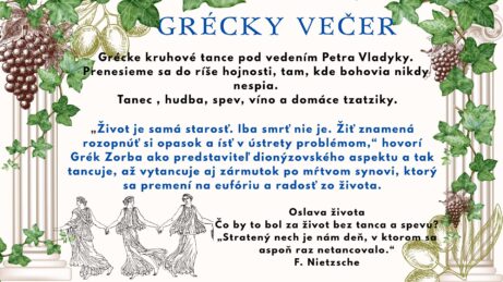 Dionísos ako predstaviteľ toho ,,čo není možné uchopiť rozumom,, nám chýba v dnešnej dobe ako soľ. Tento divoký boh, ktorý roztrhá na kúsky každý poriadok, ktorý stojí v ceste životu, nás bude sprevádzať ďalej do noci. Spoločne sa pod vedením Petra Vladyku sa naučíme (voľne, nejde o striktné techniky) grécke kruhové tance v sobotu večer. Hudba, spev, víno , domáce tzatziky. Proste večierok, ktorý stojí za to.