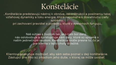 Cyklus je postavený tak aby sme sa dotkli základných oblastí nášho života. Pracujem metódou konštelácii, kde každý jasne uvidí presne to, čo je pre ňho dôležité. Konštelácie nám pomôžu dať miesto tomu, čo doteraz miesto nemalo. Tak sa stávame sami sebou.